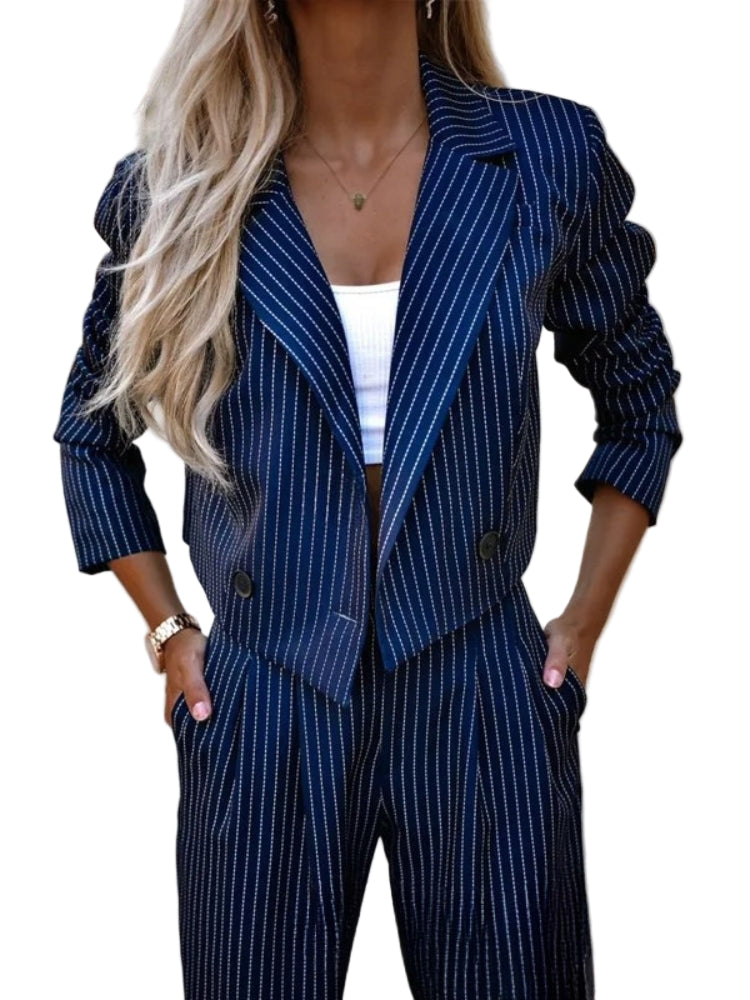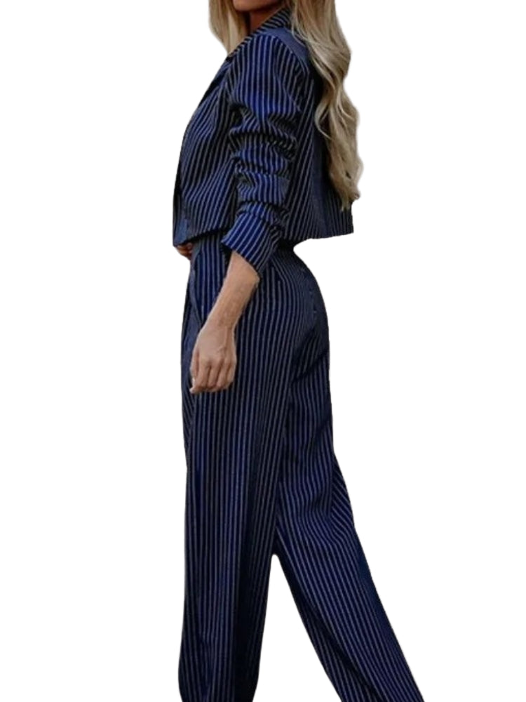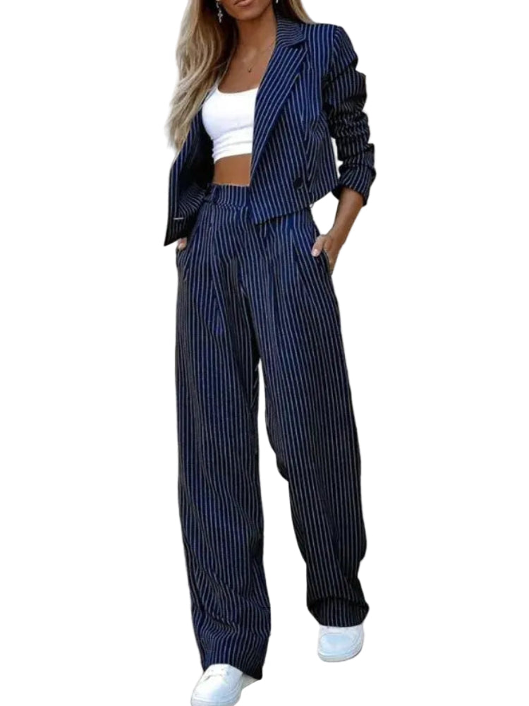 Dette todelte sæt består af en stribet blazer kombineret med matchende bukser, hvilket skaber et elegant og moderne look. De lodrette striber tilføjer visuel interesse og forlænger silhuetten, mens den strukturerede blazer giver outfittet en raffineret, skræddersyet kant.